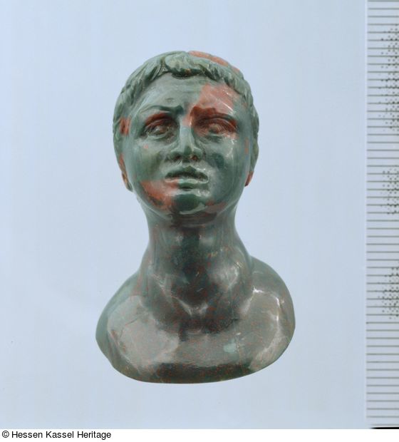 Die Büste ist vollplastisch gearbeitet und kann nicht als Kamee bezeichnet werden. Im Vergleich zu der anderen Büste mit dem gleichen starken Leidensausdruck ist das hier besprochene Stück etwas feiner in den Gesichtszügen, der Hals ist etwas schlanker gestaltet. Die Haare der antikisierenden Frisur sind in breitem Schnitt schematisiert. Die Buntfarbigkeit des Jaspis ist bei diesem Stück zurückhaltender, vor allem am Hals ist lediglich ein leichter roter Hauch vorhanden.