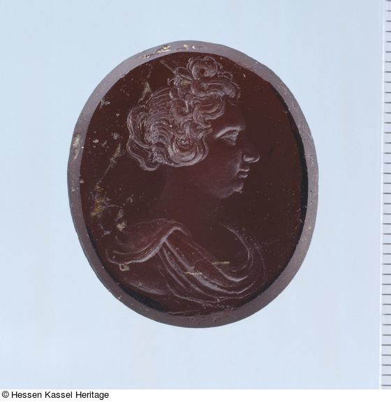 Brustbild der Landgräfin Maria Amalia (1653-1711), Gemahlin des Landgrafen Karl von Hessen-Kassel, nach rechts ins Profil gewendet. Die in Locken aufwendig gelegte Frisur ist oben aufgebauscht und hinten zusammengefaßt, ein lockeres Haarteil fällt separat am Hinterkopf. Die Dargestellte trägt ein weich geschwungenes antikisierendes Gewand.