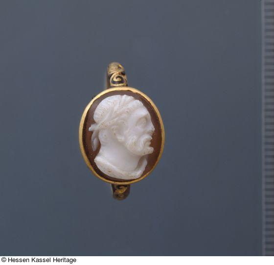 In einen leichten Fingerring ist als Kopfstück ein relativ kleiner Sardonyx eingelassen, der einen bärtigen Herrscher mit Lorbeerkranz im Profil nach rechts zeigt. Die herabfallenden Bänder des Lorbeerkranzes am Hinterhaupt und der schmale Gewandansatz am Hals sind lediglich schematisch angedeutet. Der kräftig herausgearbeitete Kopf füllt die Fläche des kontrastreichen Sardonyx bis zum Rand.