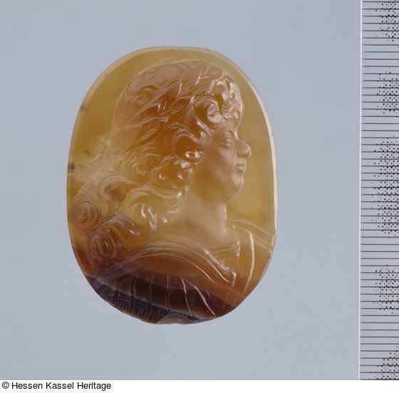 Insgesamt kann man den hier besprochenen Kameo mit B XVI. Tab. B-I-12, aber auch mit B XVI. Tab. B-V-2 und B XVI. Tab. B-V-4 zusammenbringen. Stilistisch gehören alle diese Kameen in die Nähe von Christoph Labhart, zumindest in seine Werkstatt; möglicherweise handelt es sich um Arbeiten seiner Gehilfen, Schüler oder Nachfolger (Meyer 1973, S. 95). Sicherlich stammt der Achat mit seinen Unregelmäßigkeiten aus einer hessischen Abbaustätte.