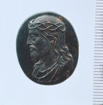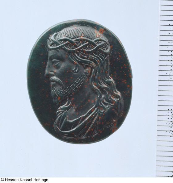 Ein verwandtes Brustbild Christi wie B XVI. Tab. B-V-43, mit Dornenkrone auf langem herabwallendem Haar, mit Gewand und Mantel, hier jedoch im Linksprofil. Das Relief ist auf ähnlich dünner Grundplatte und in noch flacherem Relief gearbeitet. Der Backenbart führt in eigenwilliger Linienschraffur zum wenig ausgearbeiteten Ohr. Unter der Dornenkrone fällt eine einzelne Locke auf die Wange herab.