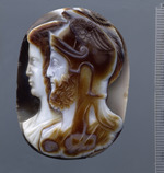 Der fünfschichtige Stein von stattlicher Größe, ein sogenannter indischer Sardonyx, ist in seiner dunkelbraun-weißen Buntfarbigkeit mit großem Können für die Darstellung genutzt worden. Die Verwendung des kostbaren Materials und die hervorstechende Technik machen den Einfluß der großen Prunkkameen der Antike deutlich.