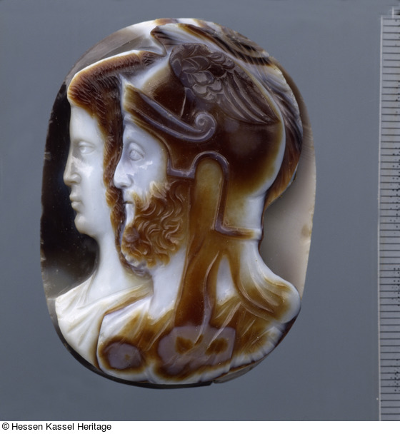 Weber bespricht bei einem Sardonyxkameo (Weber 2001, Nr. 157, Taf. XVII, mit weiterführender Literatur), der ebenfalls ein antikes Herrscherpaar zeigt, ausführlich diesen Themenkreis und die seit Jahrhunderten geführte Diskussion um die Identifizierung. Dort erwähnt sie die hier vorliegende Kasseler Kamee (Weber 2001, S. 99) und stellt fest, daß sie von Landgraf Karl erworben wurde, der einen großen Teil seiner Sammlung 1710 von dem Nobile Capello in Venedig erwarb. Dies ist reine Spekulation, da bisher ungeklärt ist, woher die Stücke des Tablars B-VI stammen. Man weiß lediglich, daß sie sich bis zum Tod von Landgraf Karl in dessen Nähe, in dem "Gewölbe unterm neuen Cabinet", befunden haben.
