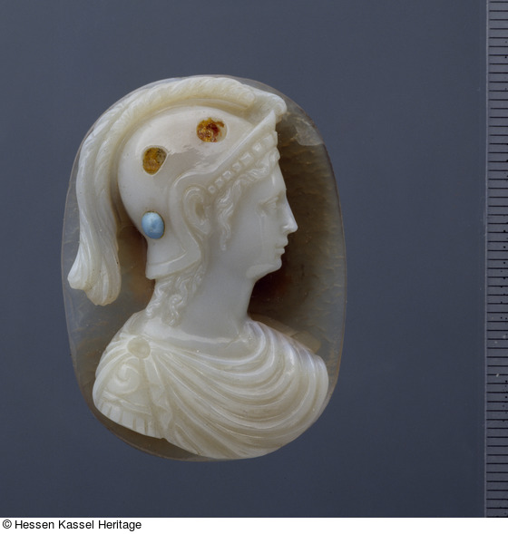 Diese Minerva-Kamee könnte aus der Kasseler Hofwerkstatt stammen. Die charakteristische spitze Nase und der kleine Mund finden sich sehr ähnlich bei einer Kamee mit weiblichem Brustbild mit Turban, die Meyer (Meyer 1973, Nr. F-3, Taf. 15,3) und Schnackenburg-Praël (in: Kat. Kassel 2001, Nr. 130) Johann Albrecht Lavilette zugeschrieben haben.