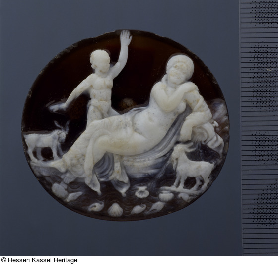 Bei dieser Kamee stellt sich die Frage nach der antiken Herkunft. Auffällig ist die gleichmäßige Abreibung der Oberfläche des Reliefs, die den Kameo zumindest als antik erscheinen läßt. In jedem Fall kann dieses Stück einer Gruppe antiker und nachantiker Kameen mit verwandten bukolischen Sujets zugeordnet werden (Weber 1992, Nr. 35). Weber verweist auf die Kasseler Kamee bei einem Münchner Kameo mit der Darstellung "Jugendlicher Flußgott in Landschaft mit Kuh" (Weber 2001, Nr. 86), den sie Ende des 16. Jahrhunderts datiert. An diese Datierung kann das Kasseler Stück angeschlossen werden.