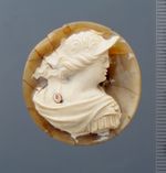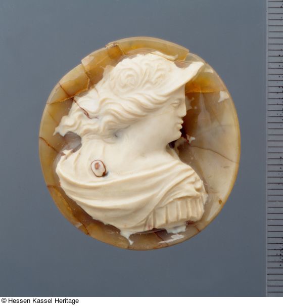 Diese Kamee beeindruckt durch den buntfleckigen Achat, aus dem sie herausgearbeitet wurde. Die figürliche Darstellung ist aus der oberen hellen Schicht gearbeitet. Der Hintergrund verbleibt in der unteren dunklen Schicht mit feinster, beinahe unauffällig roter Äderung und ist konkav eingezogen.
