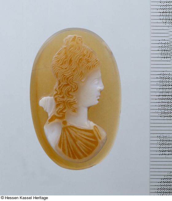 Daneben existieren zahlreiche weitere antike Diana-Kameen mit hochgebundenen Schopf und Köcher in Berlin (Furtwängler 1896, Nr. 11109 f.) und vor allem in der Eremitage in St. Petersburg (Neverov 1988, Nr. 114-116; AK Zürich 1993, Nr. 129) und in Paris in der Bibliothèque Nationale (Vollenweider 1995, Nr. 97, 98, 99 und 131). In London im British Museum (Dalton 1915, Nr. 73, 75, Taf. VI) findet sich der ähnliche, etwas steife hochovale Diana-Typus, der unserer Kamee mit geschlossenem Köcher, ohne sichtbaren Bogenansatz, entspricht. Diana/Artemis war die populärste Göttin der Griechen und trat im Kult besonders hervor. Sie galt als Herrin der Tiere, auf der Peloponnes galt sie speziell als Fruchtbarkeitsgöttin.