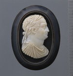 Die 'Versenkung' des Hintergrundfeldes ist von einem erhabenen Randstreifen umgeben. Diese Clipeus-Technik ist für eine Gruppe von Kameen am Anfang des 17. Jahrhunderts ein charakteristisches Merkmal. Bei diesem Exemplar besteht das silhouettierte Reliefbild mit dem Brustbild eines Imperators aus weißem Chalcedon. Zum Oberkopf und nach unten zur Rüstung hin changiert die Färbung zum Rosé-Gelblichen. Diese wechselnde Farbigkeit bewirkt einen sehr lebendigen Eindruck, möglicherweise wurde sie künstlich hervorgerufen.