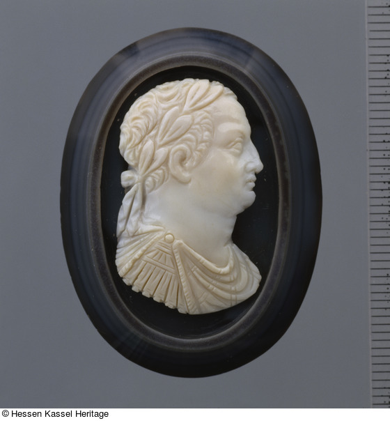 Das Chalcedonrelief ist auf einer Achatplatte befestigt. Ein erhabener Rand umgibt das vertieft wirkende Bildfeld und führt zur außen abfallenden Randschräge, die in höchst differenzierten Blau-Grau-Abstufungen verwendet wurde. Der Kontrast zwischen dem hellen Relief und der reizvoll dunkelblauen Achatplatte läßt das nach rechts gerichtete Profil des Imperators zur Geltung kommen.