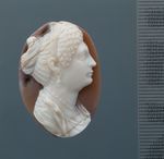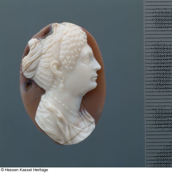 Der hier besprochene Kameo orientiert sich in den Porträtdetails exakt an dem Aquamarin in Paris. Es fehlen lediglich das Spiralrankenornament auf dem Diadem und der geflochtene Träger als Halter der Stola. Der Stein ist jedoch in Kameentechnik auf einen Karneolonyx umgesetzt worden, das weiße Porträt wirkt kontrastreich und durch die raffinierte rosa-violette Hintergrundfarbe zugleich weich. Es handelt sich hier um ein besonders qualitätvolles Stück, etwas beeinträchtigt durch den schlechten Erhaltungszustand mit mehreren Rissen auf dem Reliefbild.