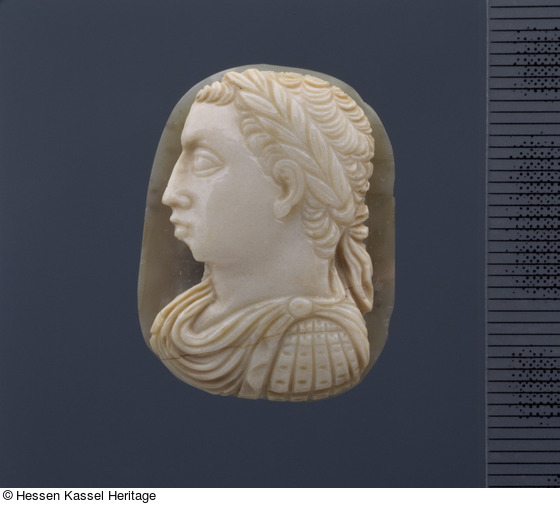 Bei diesem Stück kann man gleichfalls an die hessische Werkstatt denken, die für dekorative Zwecke gezielt solche Imperatorenköpfe herstellte. Die beiden Imperatorenkameen wirken relativ einfach gearbeitet, möglicherweise bedingt durch die Verwendung, da sie lediglich für eine Fernsicht geplant waren oder unfertig liegengeblieben sind.