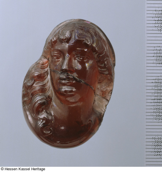 Die Kamee aus aubergine-dunkelrotem Rubin wirkt vor allem durch ihre Farbe, ihren Glanz und die Bewegtheit der Darstellung. Sie zeigt ein wohl männliches Brustbild en face, dessen Kopf leicht nach links gewendet ist. Das füllige Haar mit Mittelscheitel fällt in Locken auf beiden Seiten lang herab. Die Gesichtszüge sind ausdrucksvoll, die Pupillen weisen eine Bohrung auf.