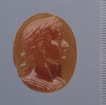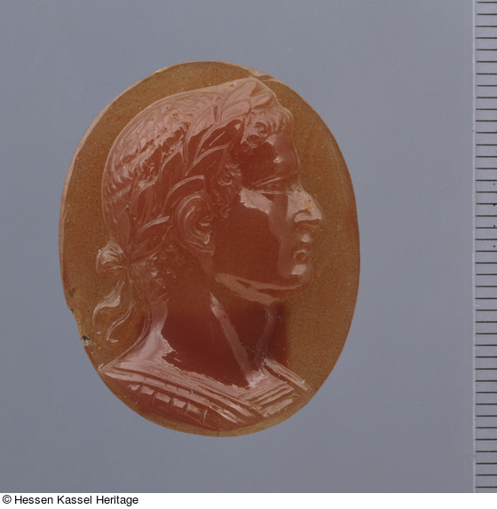 Das Profil mit leicht gebogener Nase läßt an Tiberius (reg. 14-37 n. Chr.) denken. Möglicherweise gehörte dieses Stück ehemals zu einer der beliebten Imperatorenserien.