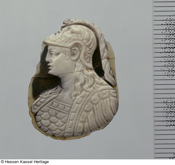 Einen verwandten Minerva-Typus mit dem charakteristischen voluminösen Brustpanzer zeigt eine Münchner Kamee (Weber 2001, Nr. 147). Weber (Weber 2001, Nr. 147) interpretiert die Darstellung "Athena trägt den Schild, letzter scheint mißverstanden zu einer Art Umhang geändert zu sein".