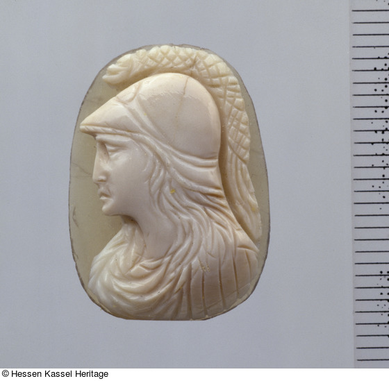 Diese Kamee mit dem Brustbild der Minerva im Profil nach links ist in flüchtiger, jedoch gekonnter stilisierter Schnittechnik gearbeitet. Der undekorierte Helm weist einen kräftigen Helmbusch auf. Minervas lange glatte Haare gehen übergangslos in die Schüsselfalten des Paludamentums über.