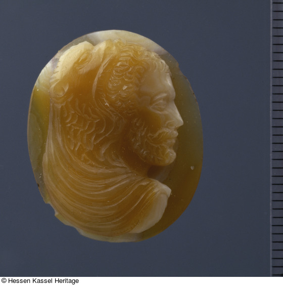 Herkules ist im Profil nach rechts dargestellt, der Schulteransatz vom Rücken her gesehen. Völkel und Pinder bezeichnen den Dargestellten in den Inventaren als Commodus mit dem Löwenhaupt des Herkules. Ein Hinweis auf Kaiser Commodus, der als geistig verwirrt galt und sich als Herkules kleidete, wäre der starre und leere Blick, der durch die angebohrte Iris im Auge verstärkt wird. Commodus wird in der Regel mit einem längeren Bart oder unbärtig dargestellt. Bei der hier vorgestellten Kamee ist der Dargestellte jedoch kurzbärtig, wie es in der Antike für Herkules üblich war. Auf dem Kopf trägt er das Löwenhaupt, das Fell fällt in Form eines Umhangs in schüsselartigen Falten in den Nacken.