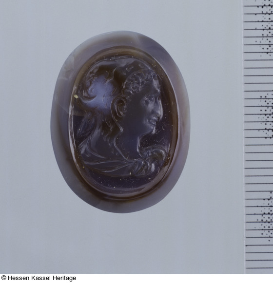 Am Anfang des 17. Jahrhunderts findet sich eine Gruppe von Kameen mit einem erhöhten Randstreifen in Clipeusform. Bei dem hier zu besprechenden Kasseler Exemplar ist die erhabene schmale Profilleiste teilweise aus der obersten braunen Schicht geschnitten, das übrige bleibt in der vorherrschenden grauen Schicht.