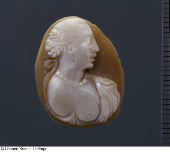 Charakteristisch für diesen am Ende des 16. und Anfang des 17. Jahrhunderts sehr verbreiteten Typus ist die entblößte Brust (Eichler/Kris 1927, Nr. 428). Die hier flüchtige Ausführung spricht für eine Serienarbeit aus einer größeren Steinschneidewerkstatt in Italien oder den Niederlanden, bestimmt zur Applikation an einem Schmuckgegenstand. Zahlreiche ähnliche Stücke befinden sich in der Münchner Münzsammlung (Weber 2001, Nr. 48-53, 57-68).