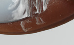 Auf dem braunen Grund ist rechts des Armabschnitts am Rand das Monogramm "C L" eingeritzt. Aus diesem Grund können wir diese Kamee C(hristoph) L(abhart) zuschreiben. Auf der Rückseite ist mit einfacher Ritztechnik ein Kreuz mit geschweiften Enden eingraviert.