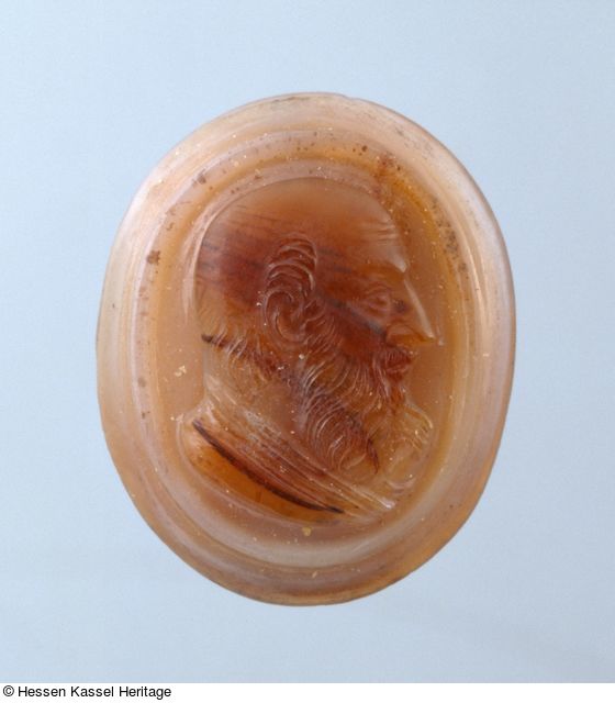 Ungewöhnlich an dieser Kamee ist der Stein mit seiner seltenen Braun-Rosé-Färbung in Clipeusform. Die Profilleiste als Umrahmung der Darstellung war in der französischen Steinschneidekunst besonders beliebt und könnte auf einen französischen Steinschneider hinweisen. Der bärtige Kopf ohne Haupthaar ist nach rechts gewendet, das Profil zeigt eine lange, scharfe Nase. Das Inkarnat ist matt poliert. Die Haarteile, der angedeutete Gewandansatz und vor allem der Hintergrund sind im Kontrast dazu poliert.