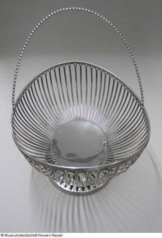 Ovaler Korb auf niedrigem, mit durchbrochenem Blattstab verziertem Fuß. Die Korbwand besteht aus einfach aneinandersetzten Drahtschlingen, die oben von einem schmalen geriffelten Band abgeschlossen werden. Ein geperlter Henkel ist mit beweglichen Scharnieren angesetzt.