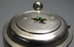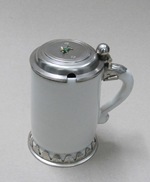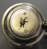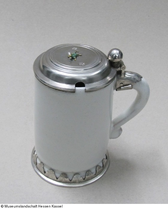 "Ein Deckeleinschnitt zum Einstecken eines Löffels weist das Fayencekrüglein als Senfgefäß aus. Die edle Fassung mit Silber, gekrönt von der farbigen Eidechsenminiatur, und das Bestreben, die Fayence mit ihrer milchig weißen Glasur in ihrer Wirkung nicht zu beeinträchtigen, verrät eine hohe Wertschätzung dieser um 1660 in Deutschland noch seltenen Keramik. Erst 1680 wurde in Kassel, als vierte deutsche, eine Fayencemanufaktur gegründet. Das Krüglein könnte daher zu holländischen Tafelfayencen gehört haben, die sich in größerer Zahl auch in der Kasseler Hofhaltung befanden. 1911 wurde es in England erworben."
