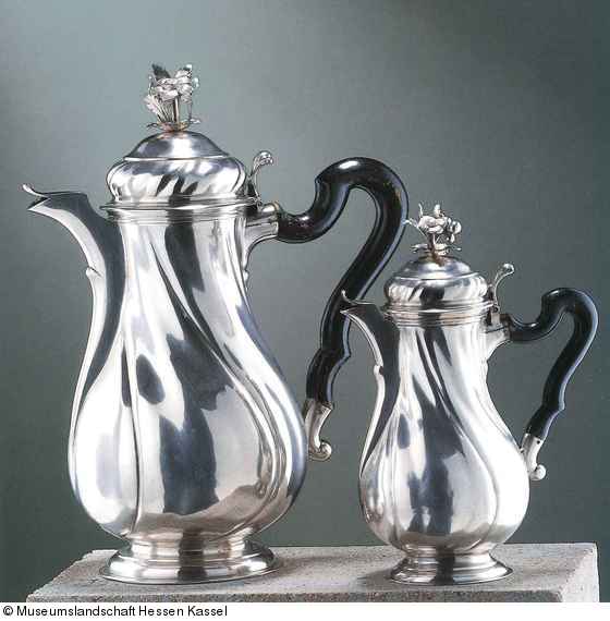 "Das Kannenpaar, in ausgewogenen Proportionen auf rundem gestuftem Fuß stehend, folgt in seiner Gestaltung bis in Details unverkennbar dem Kasseler Typ, wie er in der Stadt schon um 1730 vorkommt. Immer gehören zwei Kannen zusammen, eine große für Kaffee und eine kleinere für die zugehörige heiße Milch. Aus geschmacklichen Gründen ist diese innen vergoldet. Baucair, der um 1780 auch schon klassizistische Formen und Dekore benutzt und damit dem Hofstil Landgraf Friedrich II. folgt, hat hier noch einmal ein elegantes, formvollendetes Paar in einem gemäßigten Rokokostil geschaffen."