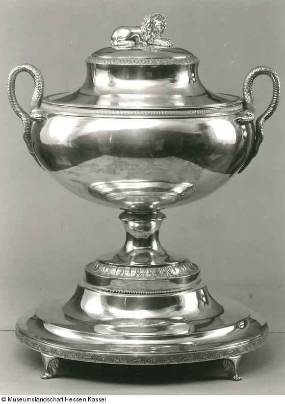 Die große Terrine mit zwei sich am Gefäß heraufwindenden Schlangenpaaren als Henkel bildete einst das Zentrum einer aufwendigen Tafeldekoration und folgte - in vereinfachter Form - der Gestaltung der Terrine aus dem Krönungsservice (1789-1804) für Napoleon I. des französischen Silberschmiedes Henry Auguste. Vermutlich diente sie als Pot d'oille, als Terrine für die sog. Olla podrida, eine Art Eintopf spanischen Ursprungs. Das Monogramm am Untersatz in Form zweier verschlungener A unter dem Fürstenhut weist auf die einstige Besitzerin Kurfürstin Auguste hin. Ein späteres Besitzermonogramm, FB unter schwedischer Grafenkrone, ziert die Gegenseite des Untersatzes.