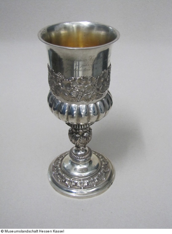"Der reich dekorierte und an der Kuppa mit einem breiten Band in Form von Weinranken umzogene Becherpokal mit Balusterschaft ist ein Geschenk der Stadt Grebenstein an ihren Pfarrer zu dessen 50jährigem Dienstjubiläum 1843. Zur Erinnerung daran trägt der Pokal die gravierte Inschrift: "Ihrem verehrdten Seelsorger Pfr: Wenderoth zum 50 jährigen Dienstjubiläum die Stadt Grebenstein d. 21. Juni 1843".