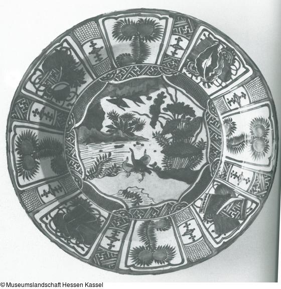 Teller mit Uferlandschaft, Wasservögeln und Lotos