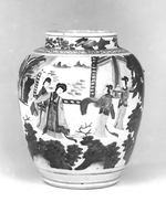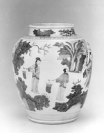 Schultertopf mit Hofdame und Dienerinnen, die Kleidung und Laternen bereithalten