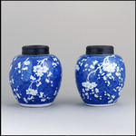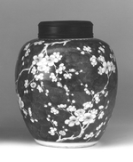 Ingwer- oder Teetopf mit Pflaumenblütenzweigen auf einem Grund wie geborstenes Eis |