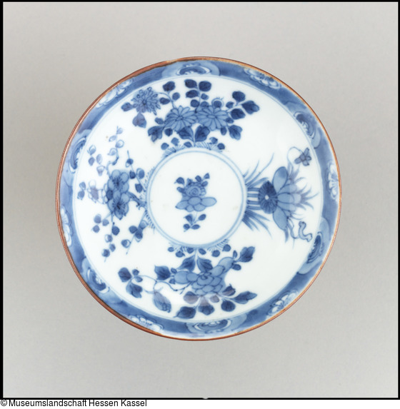 Porzellan; außen braune Glasur, innen Unterglasur-Kobaltblau