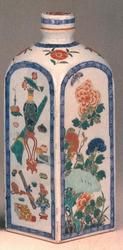 Vierkantflasche mit Landschaft, Blütenzweigen und Symbolen aus den Hundert Altertümern