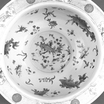 Porzellan; Aufglasurfarben in Rosa, Grün, Blau, Aubergine, Schwarz, Eisenrot und Gold |