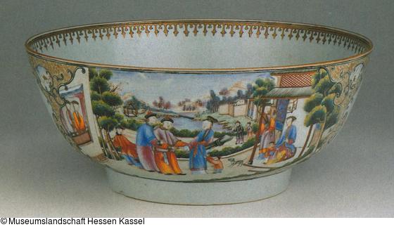 Porzellan; Aufglasurfarben in Rosa, Gelb, Blau, Grün, Eisenrot, Schwarz und Gold |