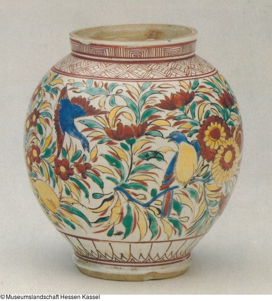 Eiförmiger Topf mit Blattwerk, Blüten und Vögeln |