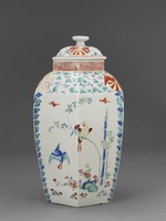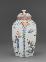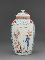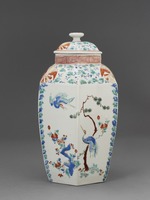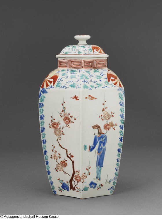 Sechseckige Deckelvase mit Figur neben einem Pflaumenbaum und Kranichen mit Kiefer