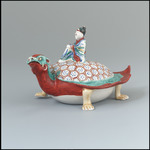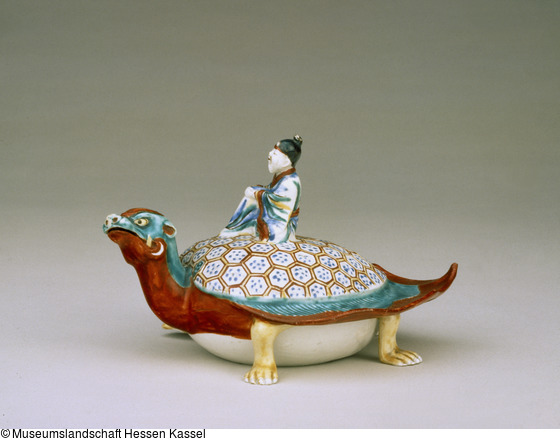 In der Ladeliste der Nieuwenhoven vom 31. Januar 1665, einem Schiff der holländischen Vereinigten Ostindischen Companie, werden unter 19229 Porzellanen auch 295 Figürchen auf Schildkröten aufgeführt. Im Inventar der Porzellangalerie von 1760/62 wird als Nr. 33 "Eine Schildkröte worauf ein Chinese reithet" genannt. Das einzige bisher bekannte, allerdings stark restaurierte Vergleichsstück befindet sich in Burghley House. Publ. U. Wiesner, 1986, S. 72ff., dort auch der Hinweis auf das von T. Volker ausgewertete Dagh-Register und die Deutung des Reitersaals Huang An Kóan oder Lu Ao (jap. Rokó), einer der daoistischen Unsterblichen. (= Kat. 1990, so auch SchatzKunst)
