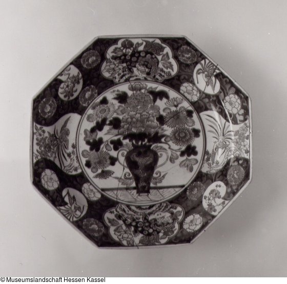 Achteckiger Teller mit Päonien und Chrysanthemen in Vase