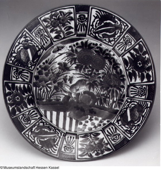 Der Dekor ahmt die chinesischen Kraak-Porzellane nach. Zwei weitere zerbrochene Teller vorhanden (Inv.Nrn. OP79d,e).