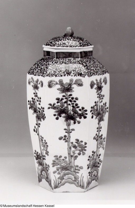 Hohe sechseckige Deckelvase mit Blütenbäumen |