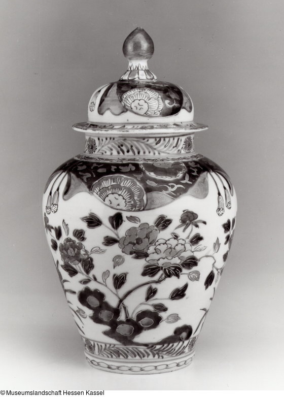 Deckelvase mit Päonien, Chrysanthemen und Zierstein