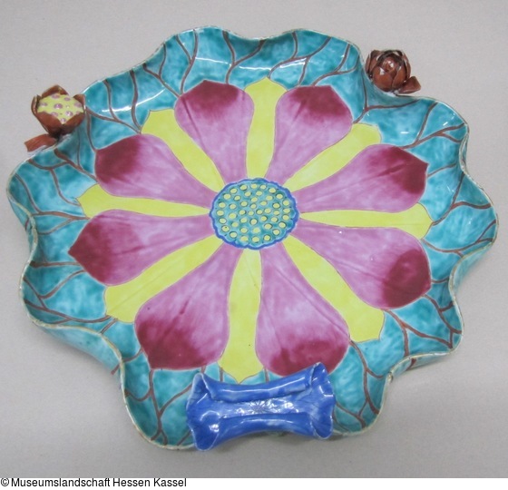 Auf die als Lotospflanzen gestalteten beschädigten Schalen (KP OP 294a-c) sind Schmelzfarben direkt auf den unglasierten Scherben aufgetragen (Email sur Biscuit). Der flache Boden der Blätter trägt eine offene Blüte mit ihren dekorativ entbreiteten Blütenblättern und dem so chrarakteristischen Fruchtboden. Über den hochgeschlagenen und sich wellenden Blatträndern ragen je eine aufspringende Knospe, ein zusammengerolltes junges Blatt und die Samenkapsel. Die Stengel dienen als Auflage. Die Schalen zeigen alle Wachstumsstadien der Sumpfpflanze.