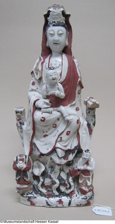 Porzellan; Blanc de Chine; Spuren kalter Bemalung in Schwarz, Rot, Gold und Blau |