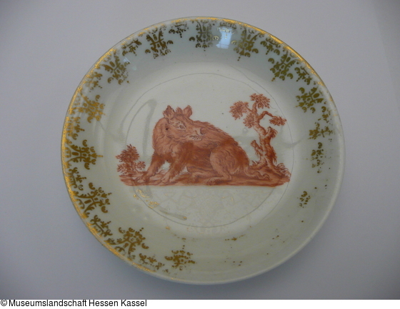 Porzellan, glasiert und bemalt, mit Goldstaffage |