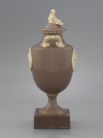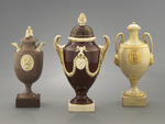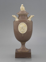 Deckelvase mit Medaillons: Merkur und Ceres. Auf dem Knauf eine in Tuch gehüllte Gestalt mit Buchrolle |