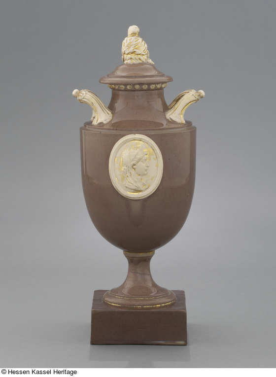 Deckelvase mit Medaillons: Merkur und Ceres. Auf dem Knauf eine in Tuch gehüllte Gestalt mit Buchrolle