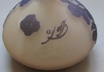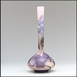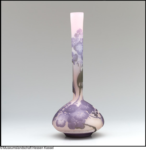 Glas formgeblasen, Fond milchig rosa, darüber farbloses Glas, violett und partiell darüber grün überfangen, in zwei Arbeitsgängen geätzt, Oberfläche innen und außen matt |