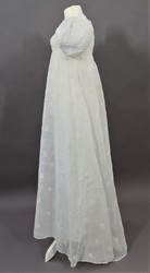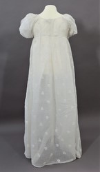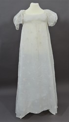Der gestickte Dekor des Batists besteht aus zwei verschiedenen kleinen Blütenzweigen, die im Wechsel in horizontalen Reihen versetzt angeordnet sind. Die Stickerei wurde vor dem Zuschnitt des Kleides ausgeführt.
